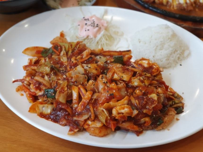 오동통한 오징어와 해물볶음을 얹은 매운 돈가스가 인기인 음식점