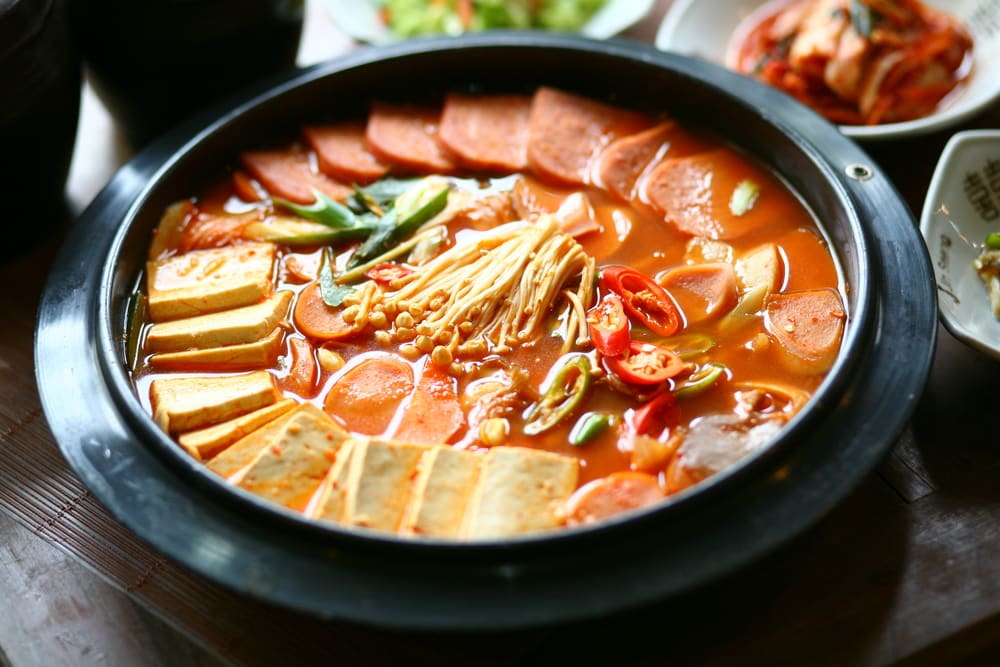 육수에 햄, 소시지, 김치, 야채, 국수 등을 넣고 끓여 만든 메뉴