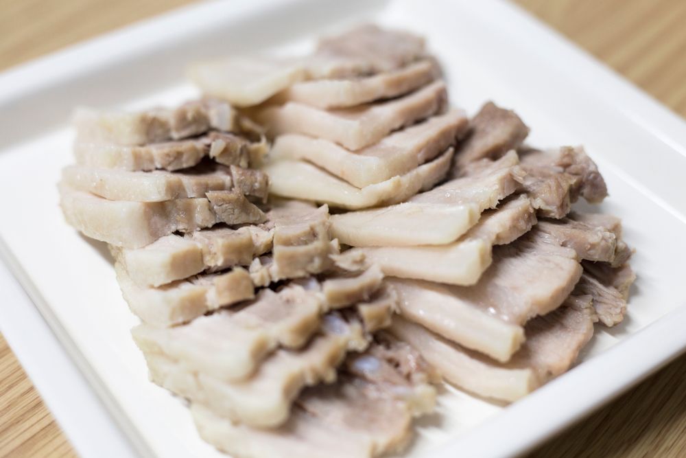 쪄낸 돼지고기와 백김치, 고추 등으로 구성된 메뉴