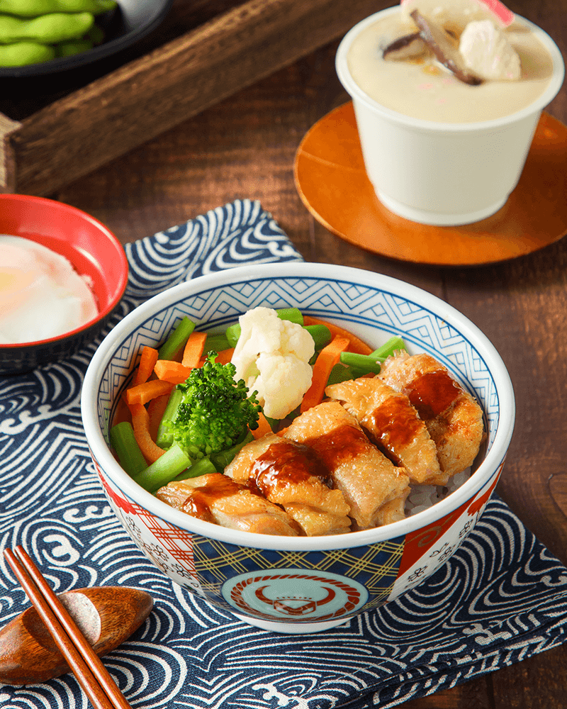 철판에 튀긴 닭과 브로콜리, 당근 등 3색 채소를 넣어 만든 덮밥과 장국을 곁드린 메뉴