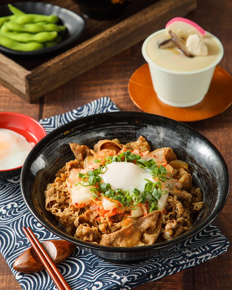 소고기를 볶아 김치, 반숙 달걀, 파를 올려 먹는 한국식 덮밥과 장국을 곁들인 메뉴
