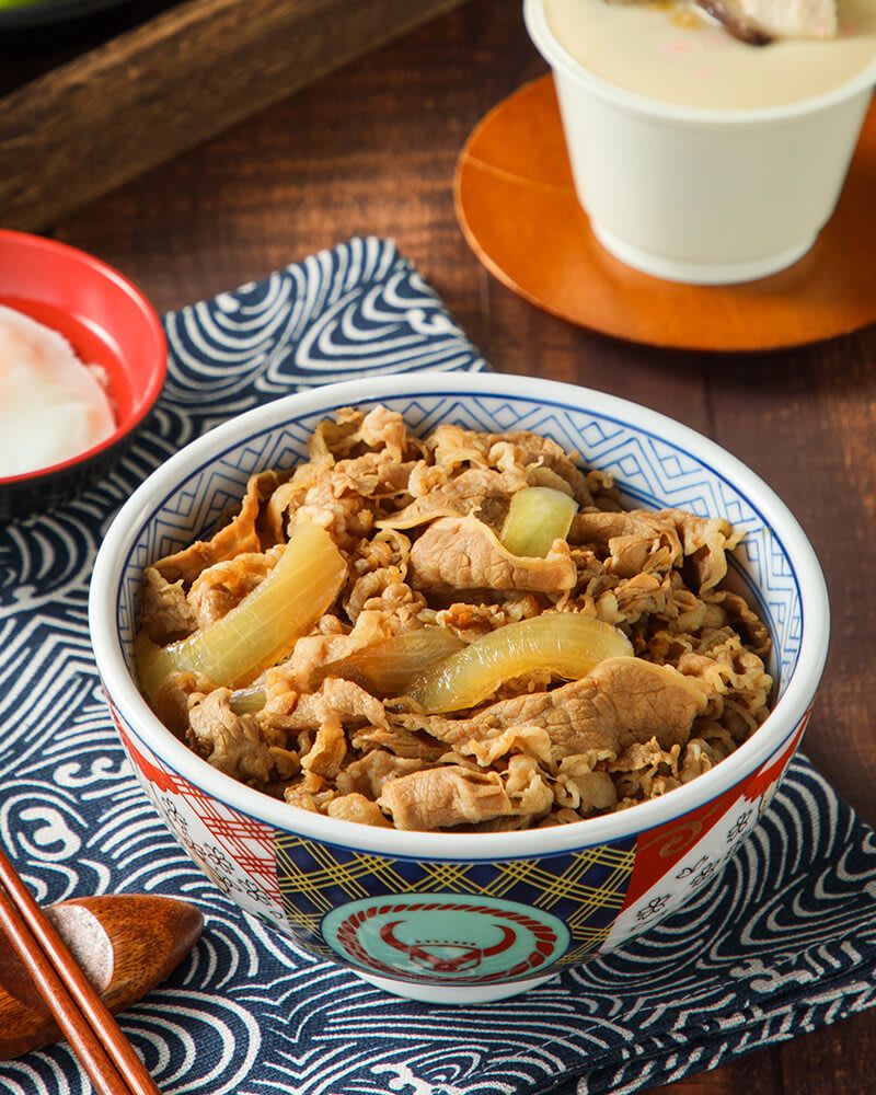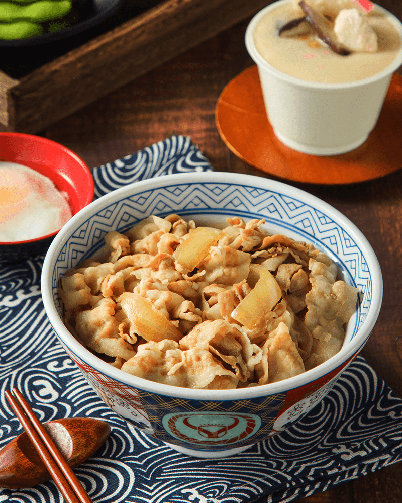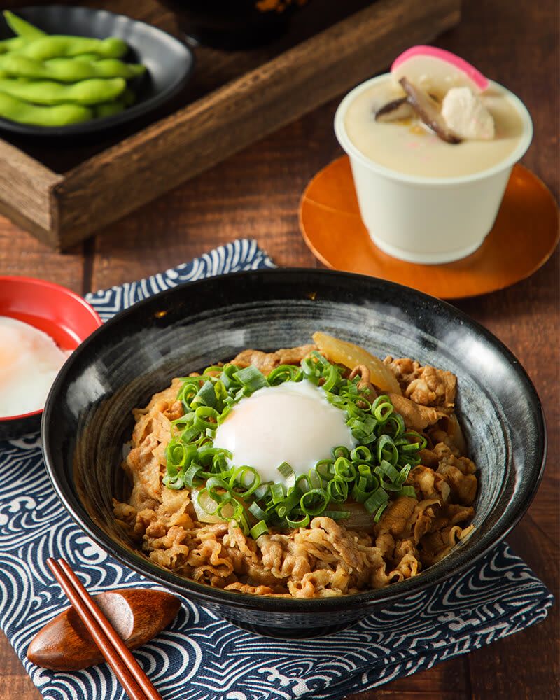 소고기와 양파를 볶아 만든 100년 전통의 시그니처 덮밥과 장국을 곁들인 메뉴