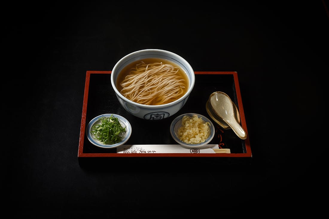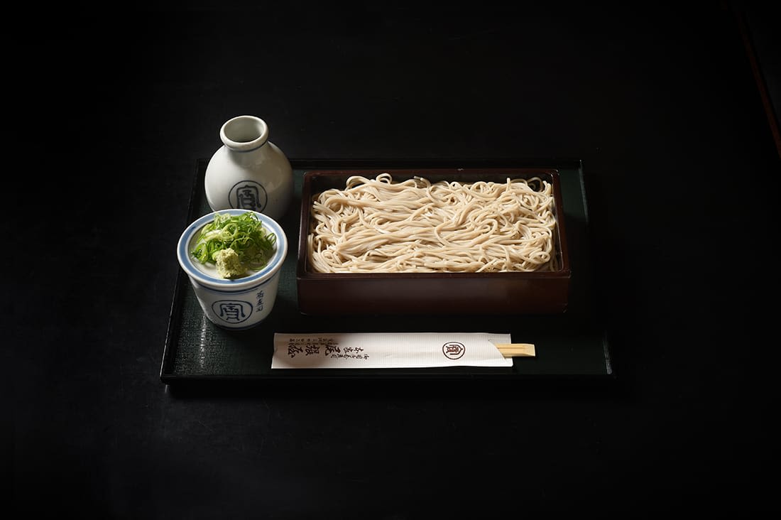 소바면에 쯔유, 파, 무, 와사비를 곁들여 먹는 요리