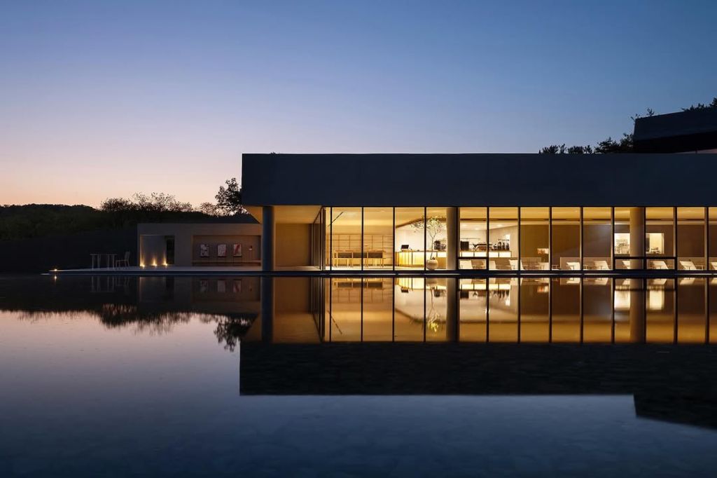 1층 통창 밖으로 펼쳐진 물의 정원이 아름다운 경주 대형 베이커리 카페