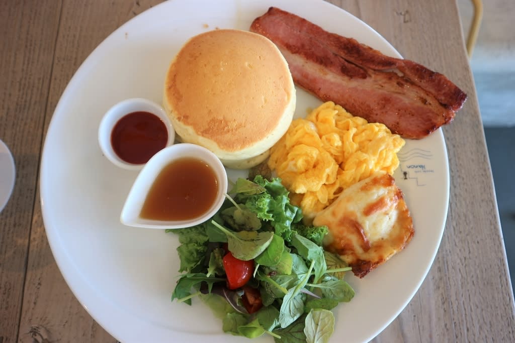 팬케이크에 에그스크램블, 샐러드, 베이컨 혹은 소시지를 곁들인 메뉴