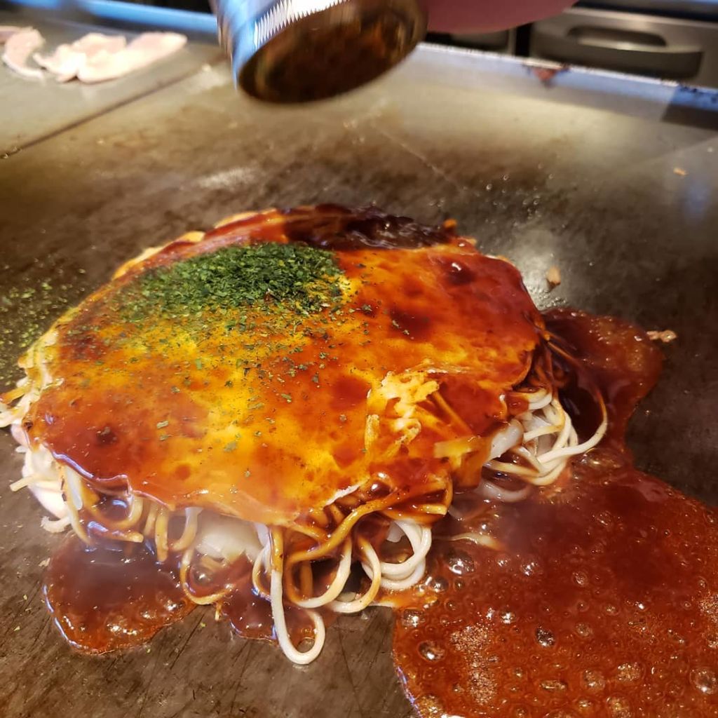 면이 들어간 히로시마식 오코노미야키를 맛볼 수 있는 로컬 음식점