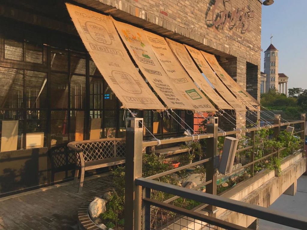 회색 벽돌과 짙은 색감의 철제를 매치한 모던한 인테리어가 특징인 카페