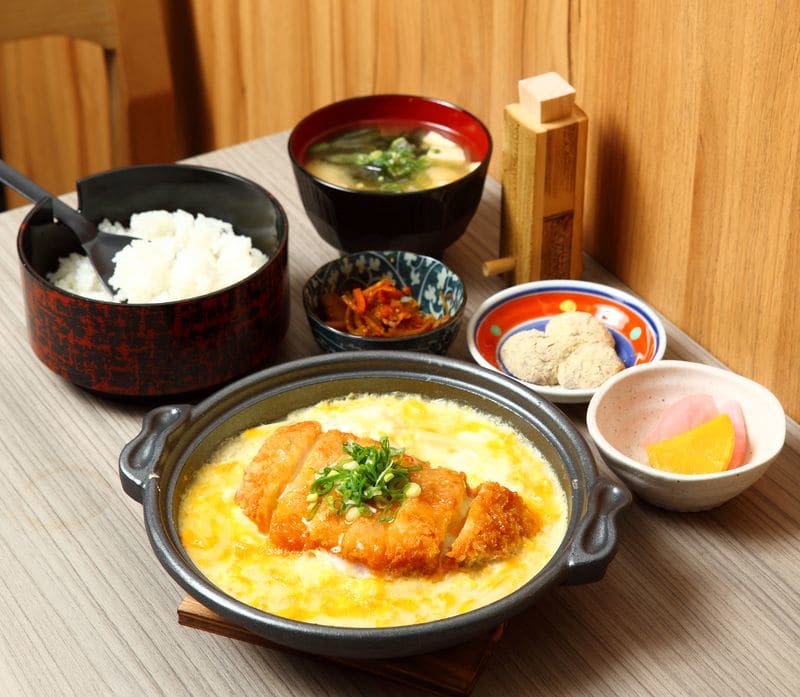 달걀을 곁들인 돈카츠, 밥, 국, 반찬이 제공되는 메뉴