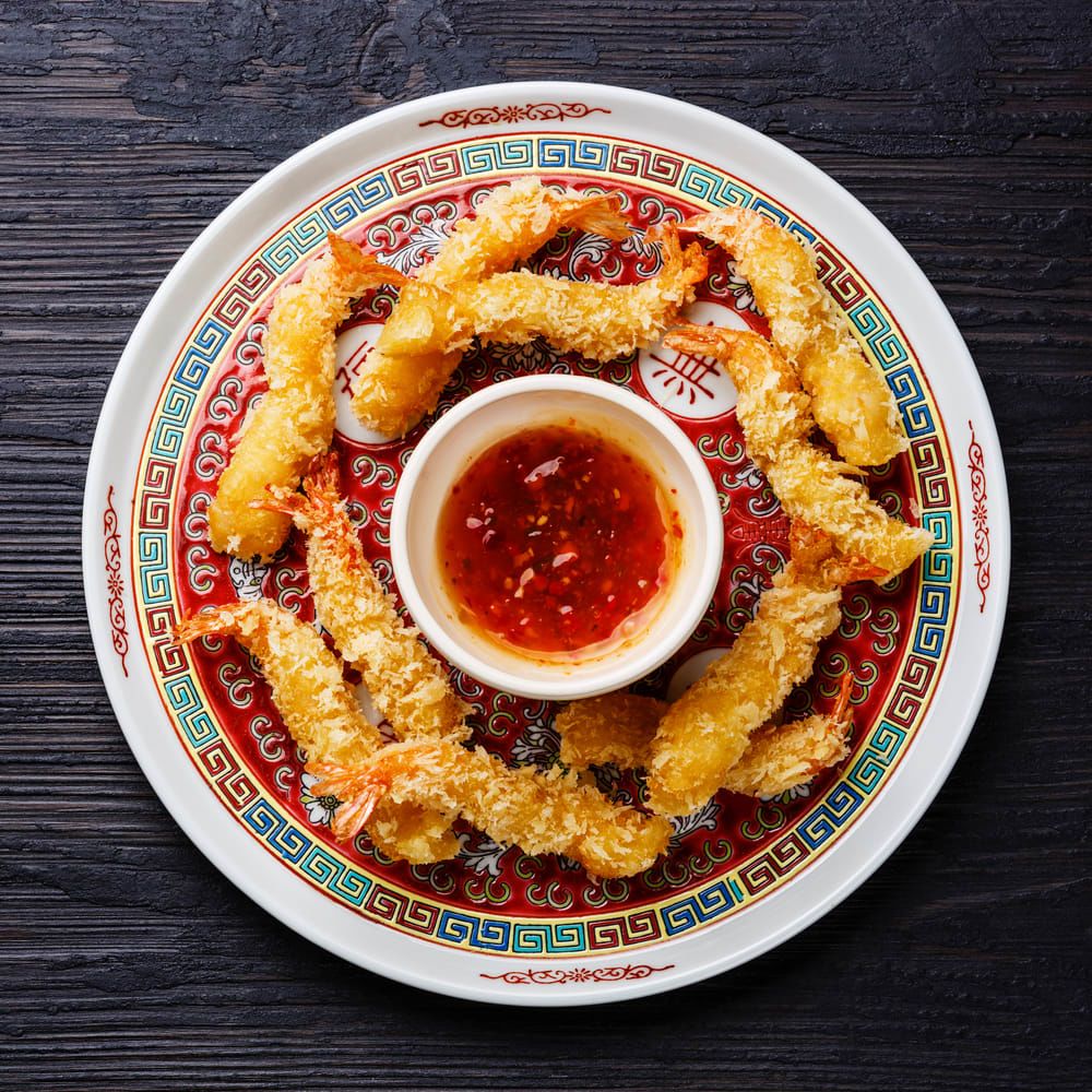 튀김옷을 입혀 튀겨낸 새우에 칠리 소스를 곁들인 메뉴