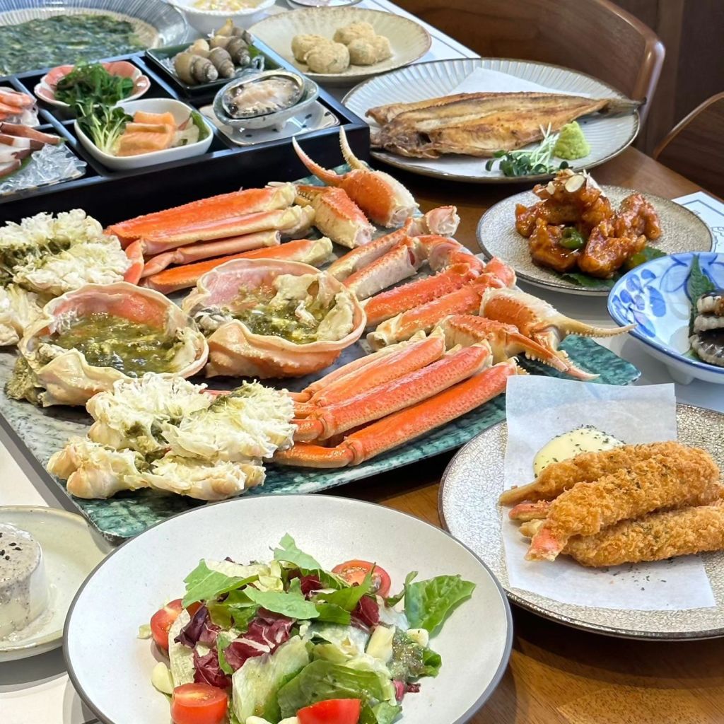 광어, 우럭, 제철 회, 대게찜 등이 포함된 세트 메뉴