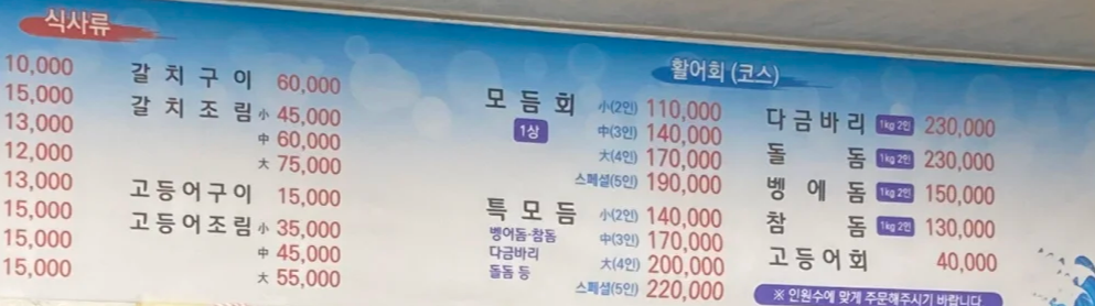 고등어, 갈치, 참돔 등 다양한 생선 회와 밑반찬으로 구성된 메뉴