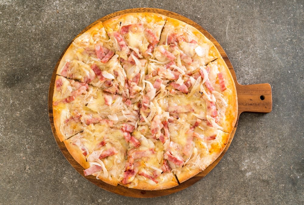 얇은 도우 위에 베이컨, 양파, 사워 크림을 얹은 타르트 플랑베