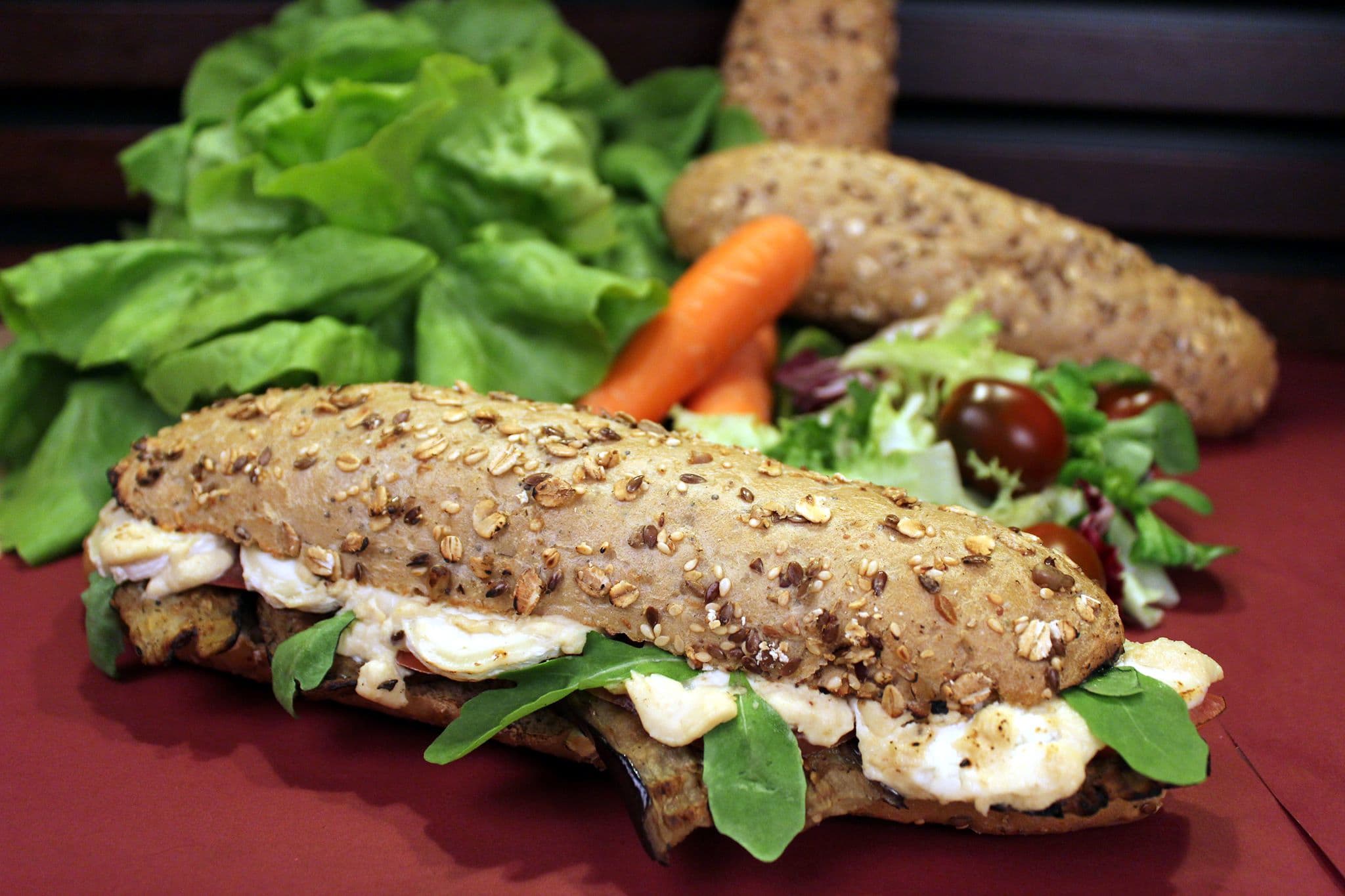 가지, 염소 치즈, 후무스, 루꼴라 등을 넣어 만든 샌드위치