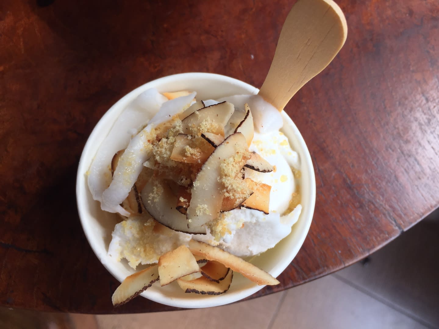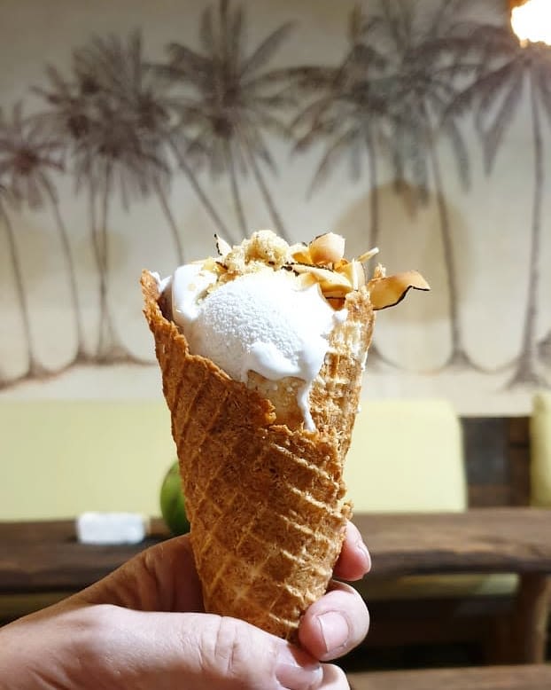 코코넛 아이스크림에 코코넛 과육과 파우더를 올려 와플 콘에 담은 메뉴