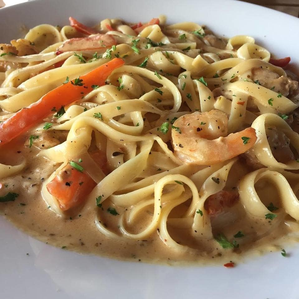 납작한 모양의 면 '링귀네 면'에 새우, 닭고기, 파르메산 치즈, 크림 소스 등을 곁들여 볶아낸 파스타