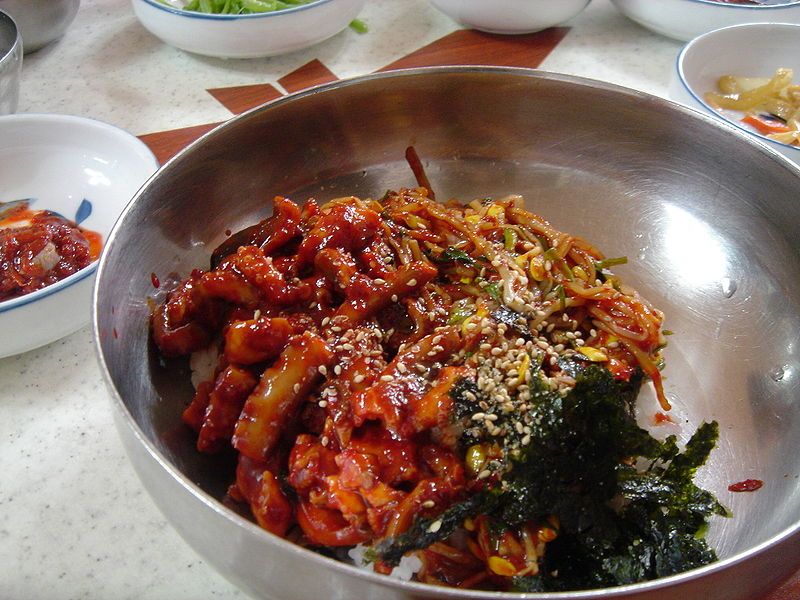 해초와 게살, 전복, 낙지 등을 곁들인 비빔밥으로 유명한 한식 전문점