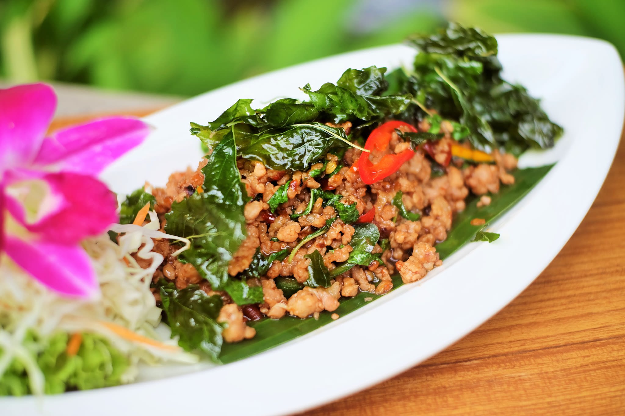 잘게 썬 돼지고기와 바질, 고추 등을 볶은 요리