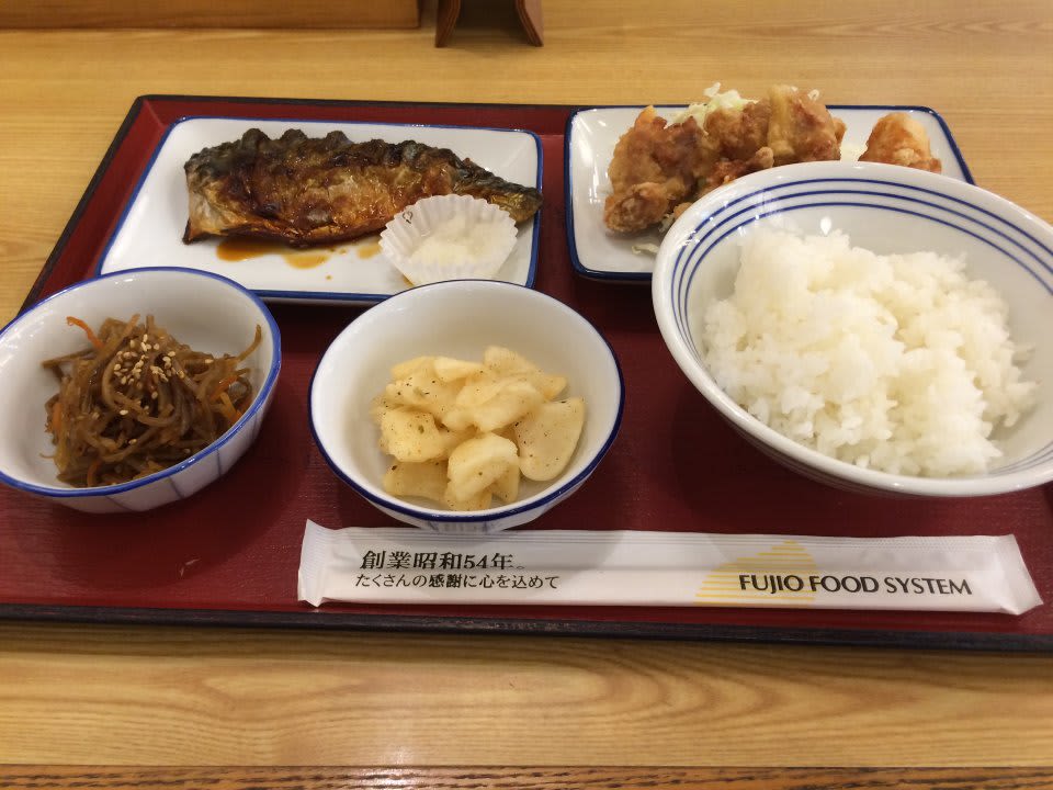 고등어 구이와 밥, 국, 반찬으로 구성된 정식