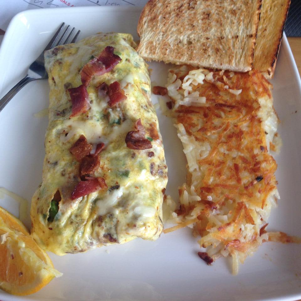 게살을 넣어 만든 오믈렛에 치즈 가루, 해시 브라운, 빵을 곁들인 메뉴 (07:00 - 11:00 주문 가능)