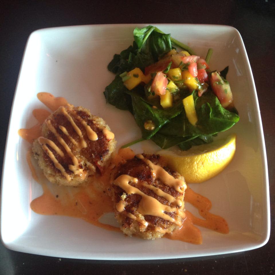 다진 게살을 둥글게 뭉쳐 튀겨낸 후 토마토 샐러드를 곁들인 메뉴