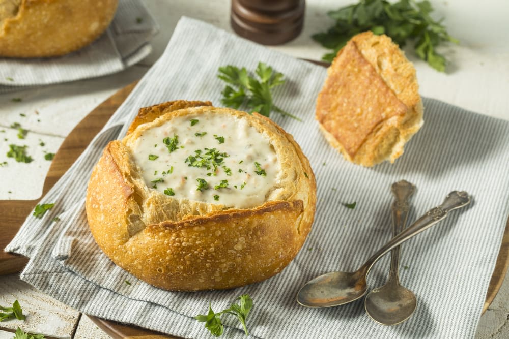 속을 파낸 빵 안에 조갯살, 양파, 감자, 베이컨을 넣고 끓여낸 수프를 담은 메뉴