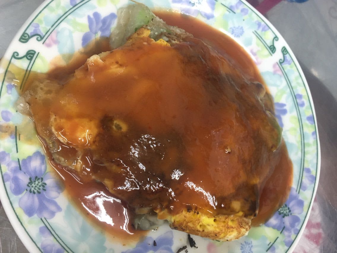 달걀에 숙주와 굴, 채소를 넣고 부쳐낸 후 소스를 얹은 대만식 굴전