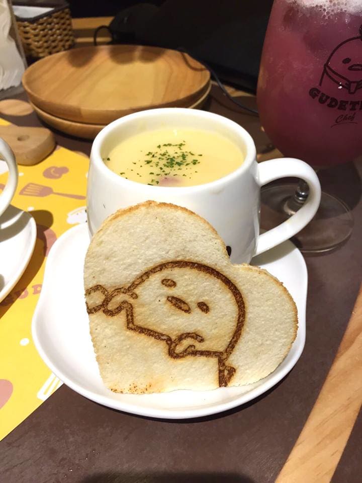 구데타마 모양의 빵을 콘 수프에 찍어먹는 요리