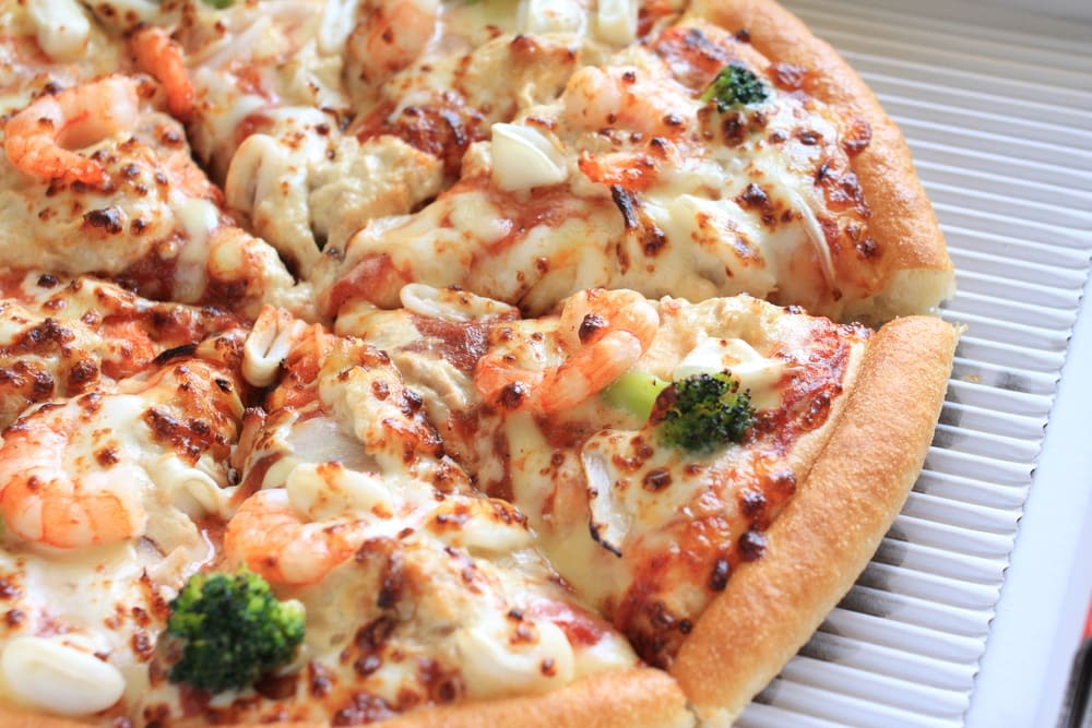 쿠데타마의 모습을 볼 수 있는 해산물과 채소가 들어간 피자