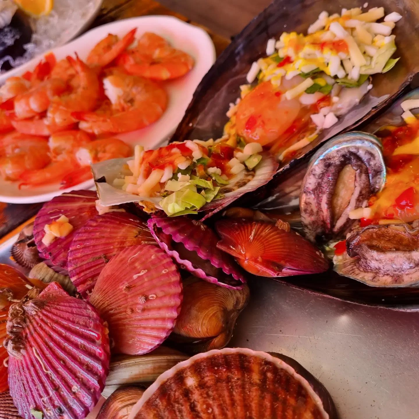 조개구이와 생선회, 대하로 구성된 세트 메뉴