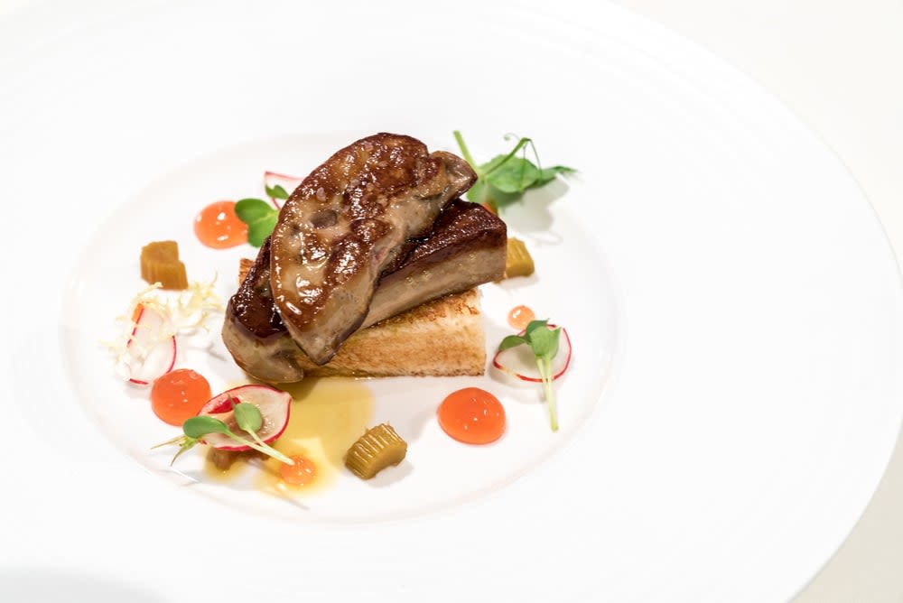 오리 간 푸아그라에 배와 생강으로 만든 소스를 곁들인 메뉴