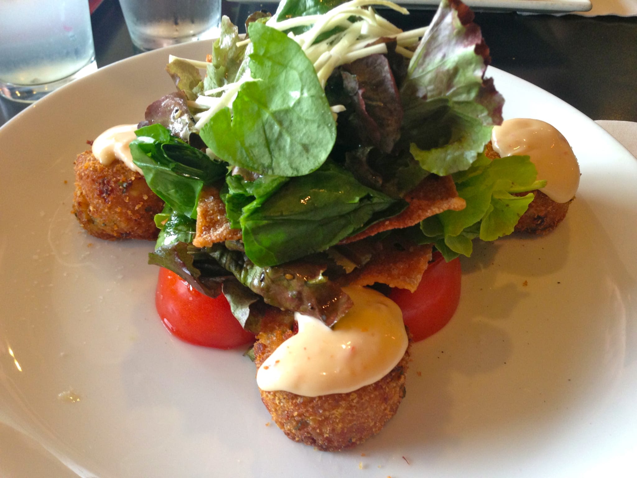게살튀김에 소스와 샐러드를 곁들인 메뉴