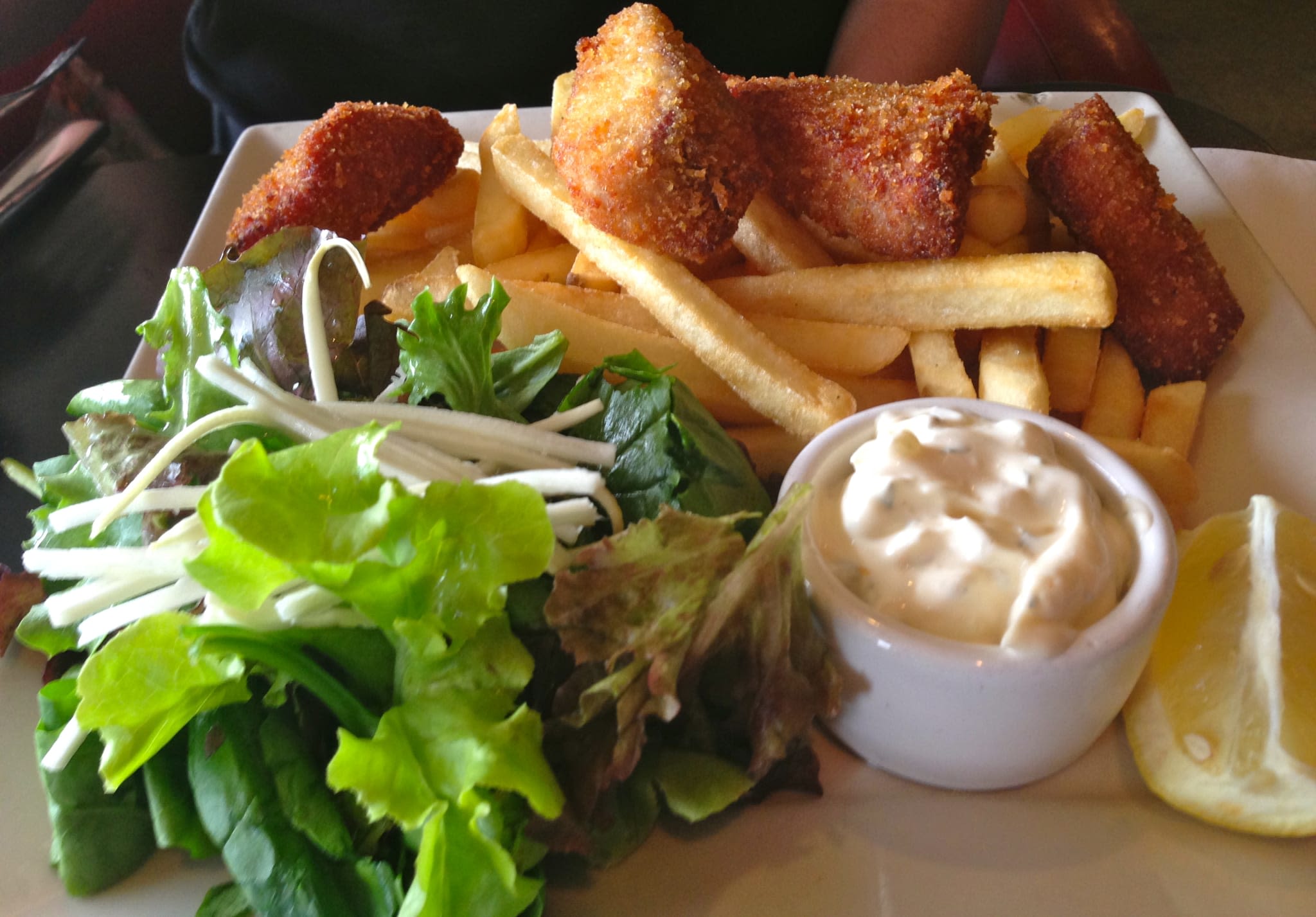 생선튀김, 감자튀김, 샐러드, 타르타르 소스로 구성된 메뉴