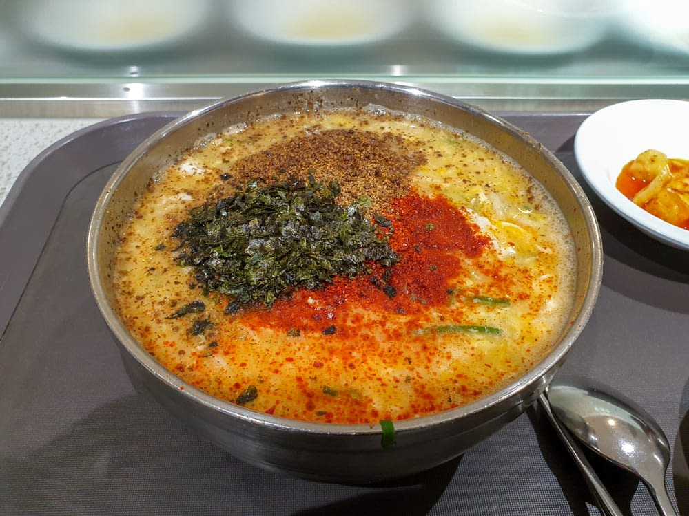 달걀과 김을 푼 국물에 들깻가루를 뿌린 고소한 칼국수로 인기 있는 맛집