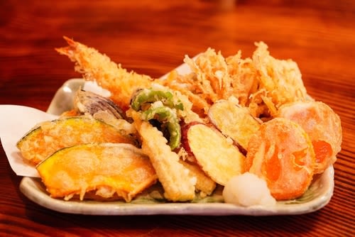 빵가루를 입혀 기름에 튀긴 호박, 새우, 오징어, 참치 등으로 구성된 튀김 메뉴