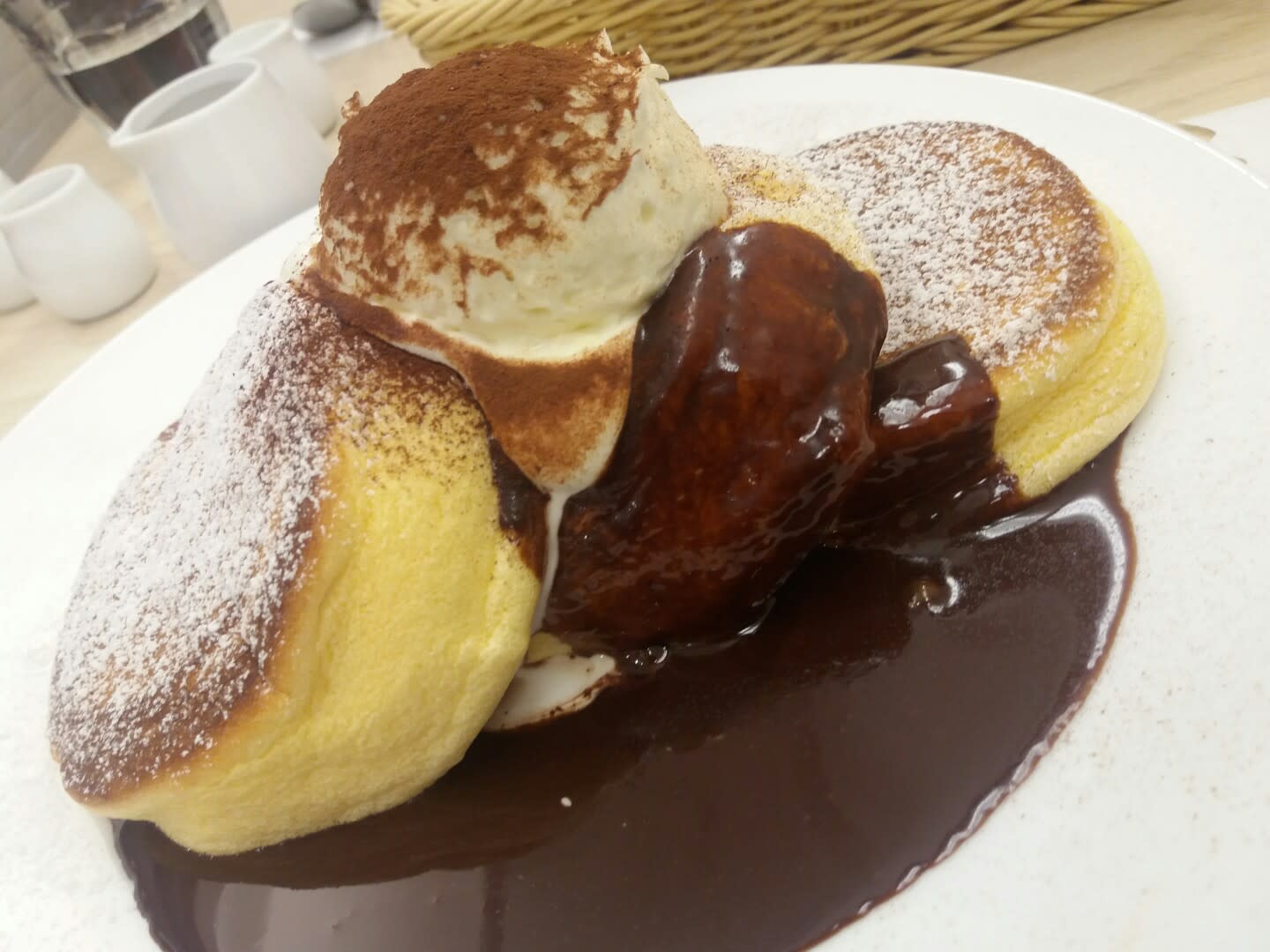 초콜릿 시럽과 커피, 생크림, 아이스크림을 얹은 팬케이크
