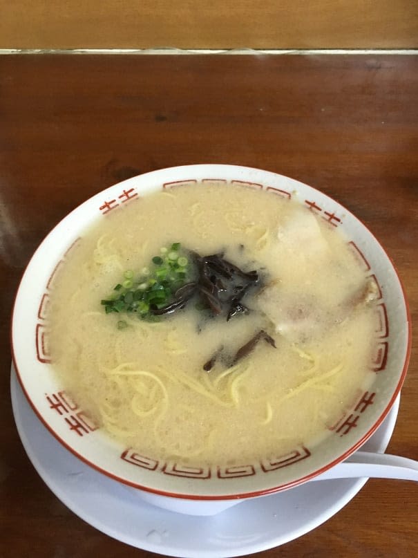 차슈와 대파, 목이버섯, 우엉 등을 올린 진한 돼지뼈 육수의 라멘