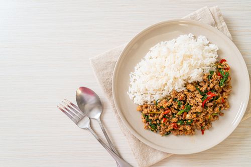 태국식 바질을 곁들여 볶아낸 다진 돼지고기와 밥으로 구성된 메뉴