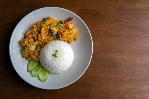 게살에 코코넛 우유, 달걀, 채소, 커리 등을 곁들여 볶아낸 요리와 밥으로 구성된 덮밥 메뉴