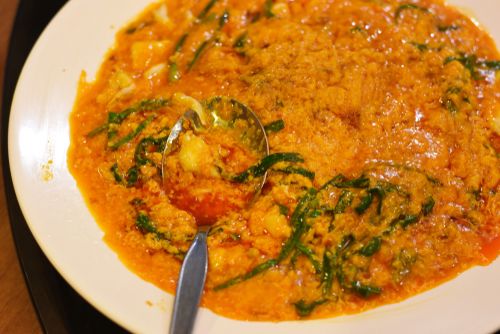 게살에 코코넛 우유, 달걀, 채소, 커리 등을 곁들여 볶아낸 메뉴