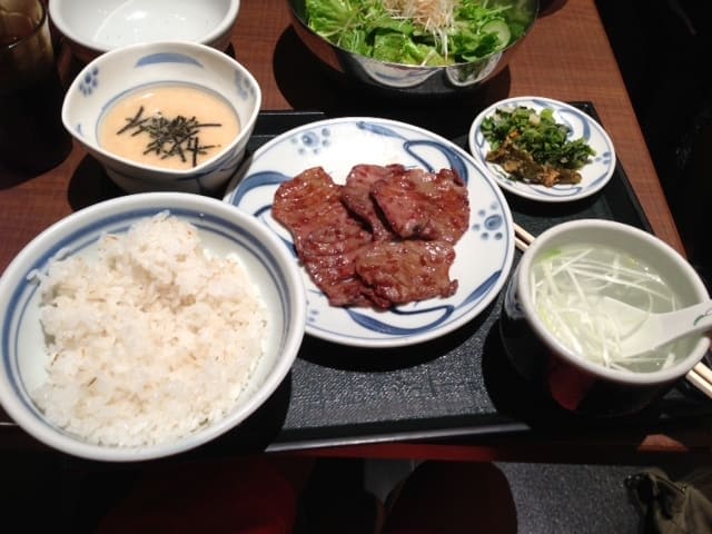 우설구이와 밥, 간 마와 채소 장아찌로 구성된 세트 메뉴