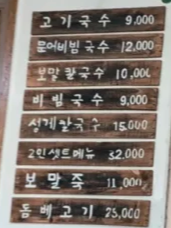 비빔 국수, 고기 국수, 돔베고기로 구성된 메뉴