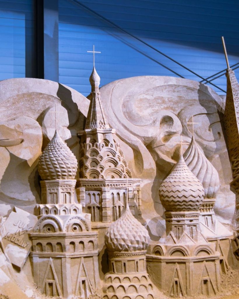 전 세계의 랜드마크 모습을 본 딴 모래 조각이 있는 대형 베이커리 카페