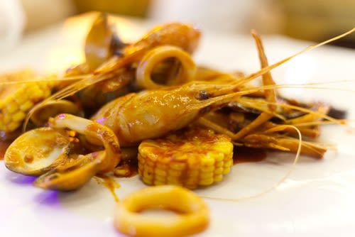 새우, 옥수수, 채소 등에 케이준 소스를 곁들여 쪄낸 메뉴
