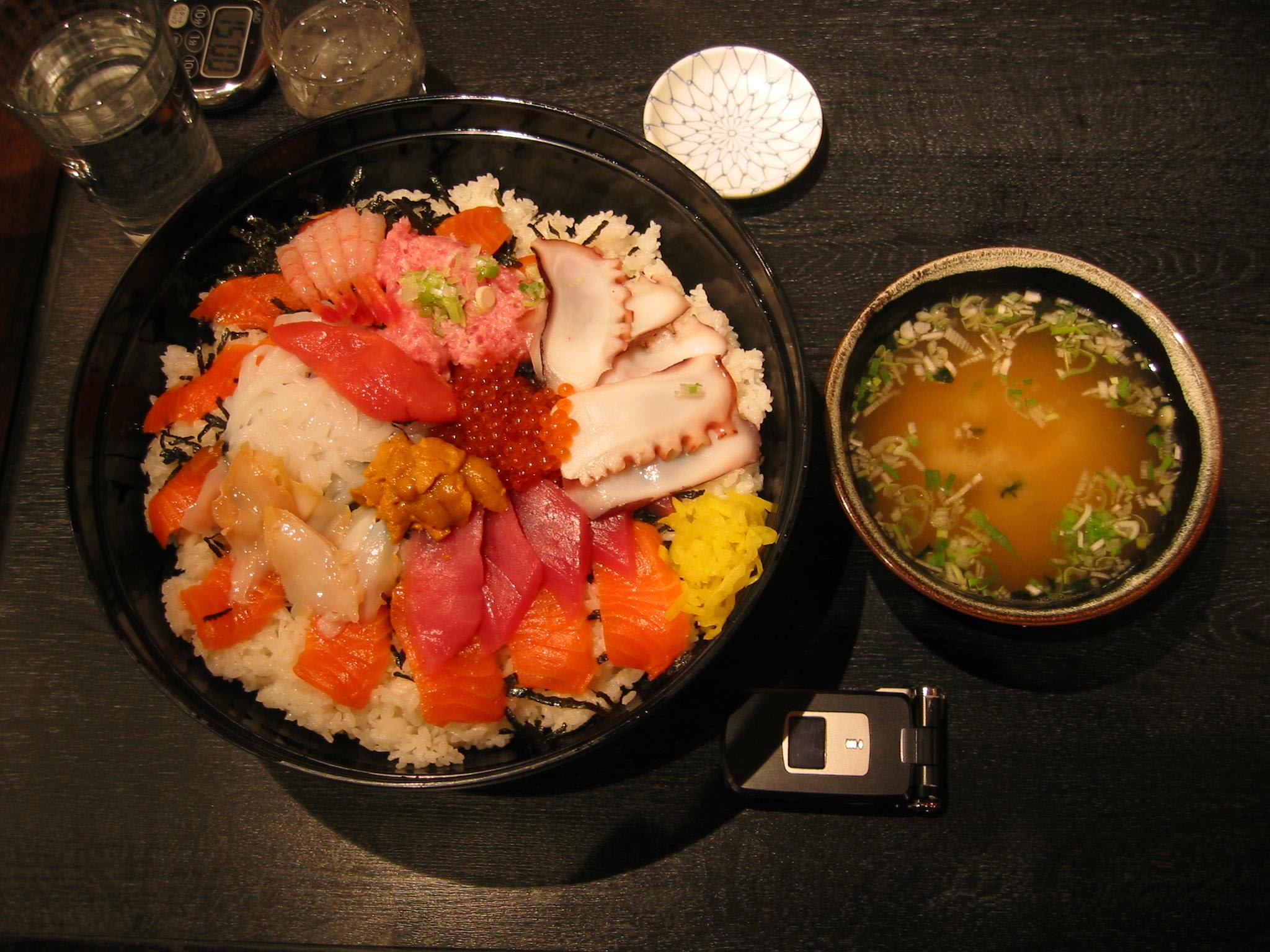 성게알과 연어알, 새우, 문어 등 여러 해산물을 올린 덮밥