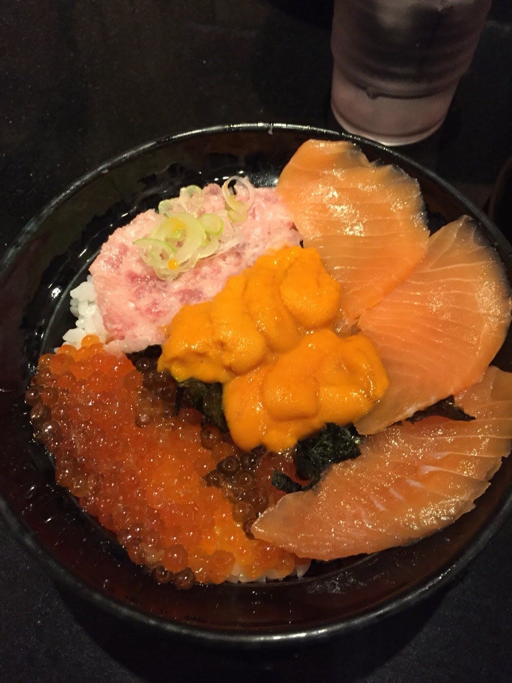성게알과 연어알, 다진 참치살과 연어를 올린 덮밥