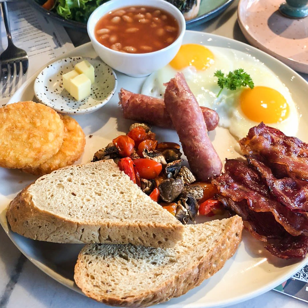 달걀 2개와 소시지, 토마토 버섯 볶음, 베이컨 등으로 구성된 브런치 메뉴