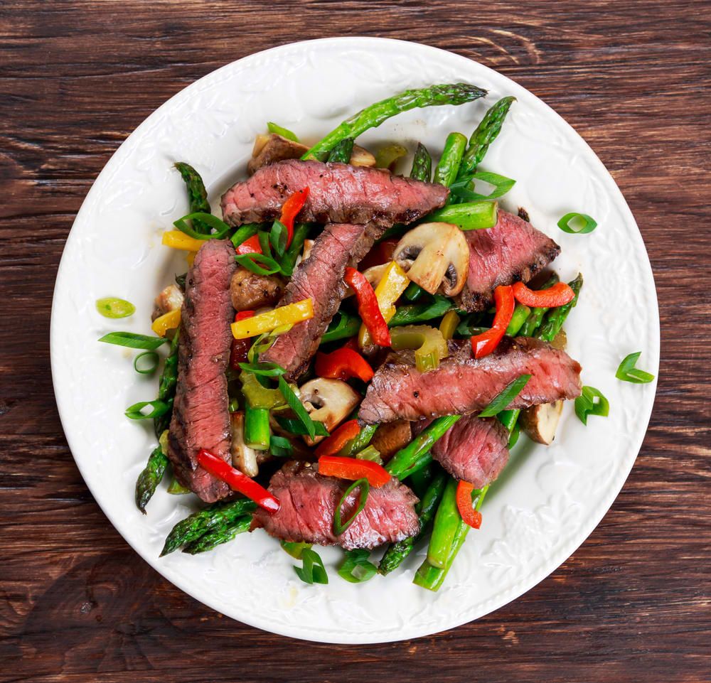 작게 썬 소고기, 양파, 아스파라거스, 고추를 팬에 함께 볶아낸 메뉴