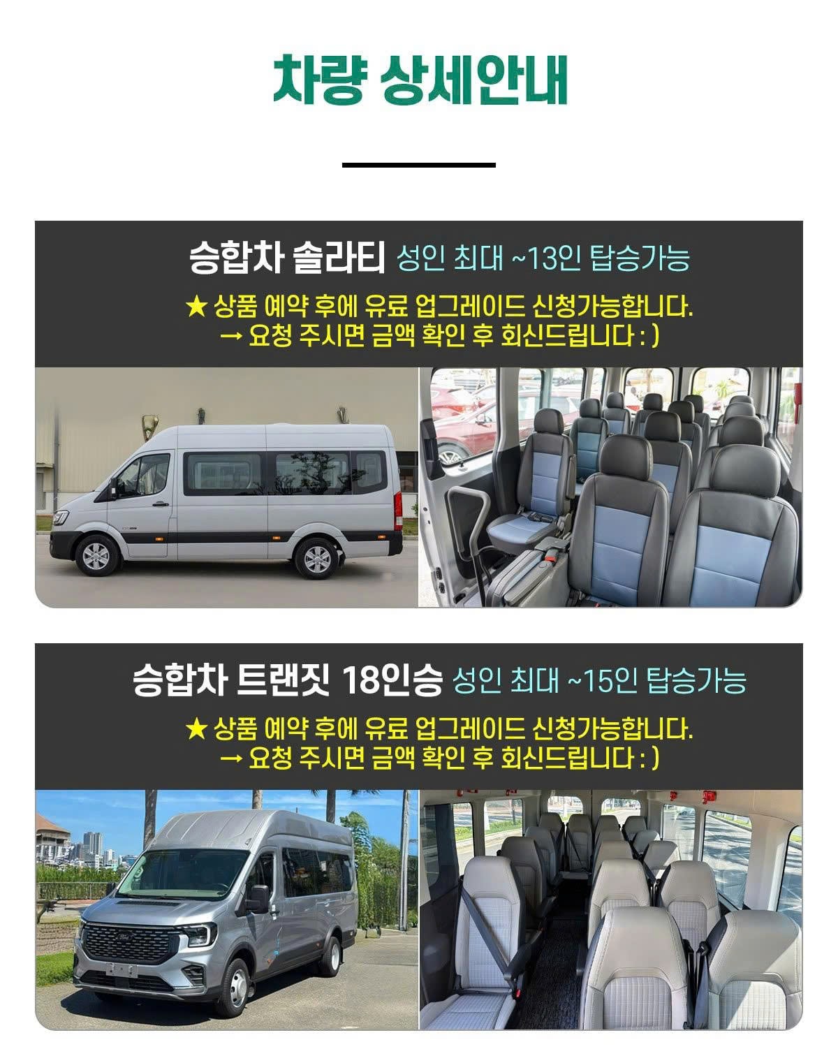 ・ 차량 추가사용 1시간당 10만동(승용차), 12만동(SUV), 15만동(승합차), 18만동(승합차16인승-트랜짓), 20만동(승합차18인승-트랜짓) 이며, 팁과 별도로 지불하셔야 합니다. (사전신청필수)