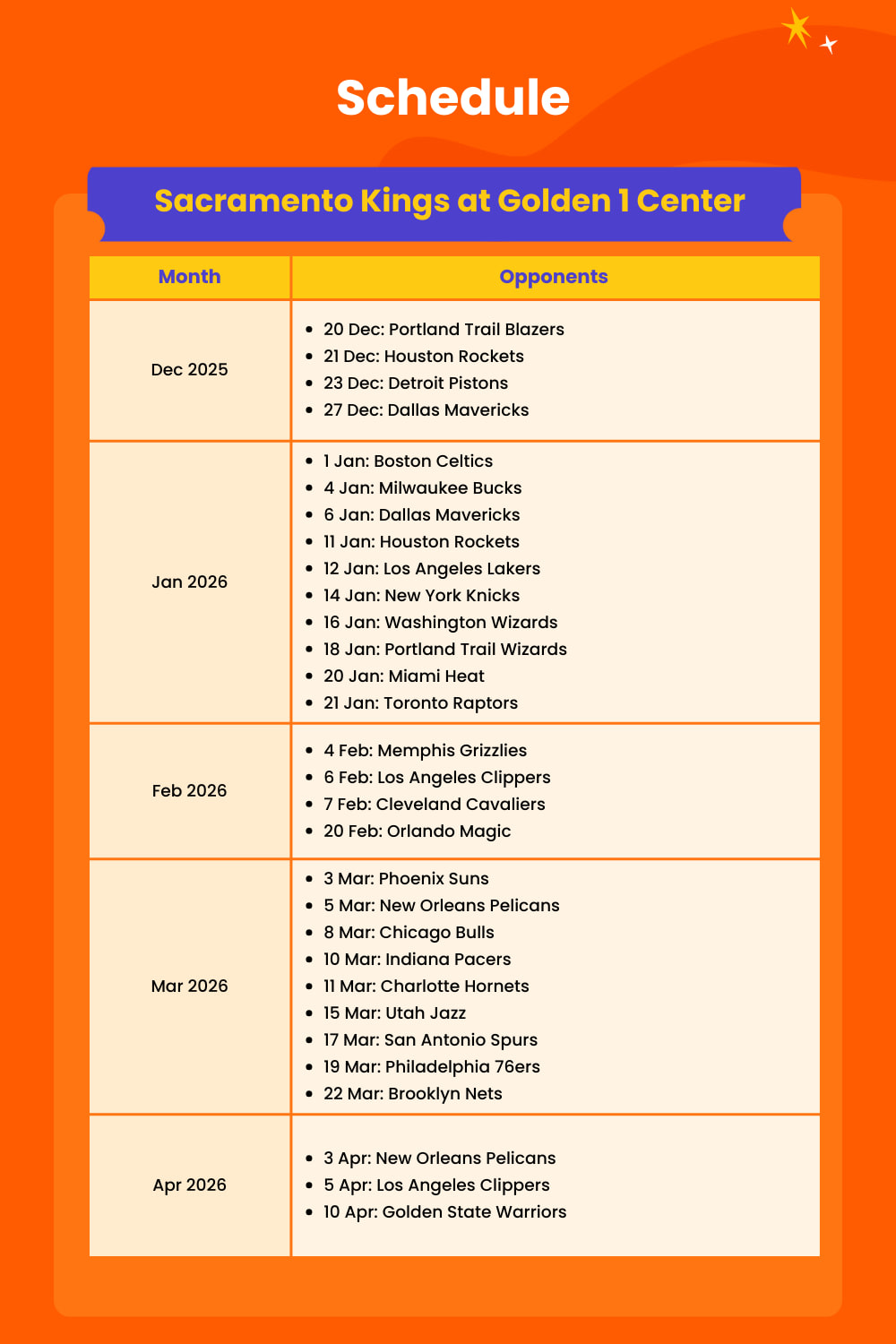 ・ 다양한 경기 날짜 중에서 Kings가 NBA 최고의 팀과 맞붙는 경기를 선택하여 관람하세요.