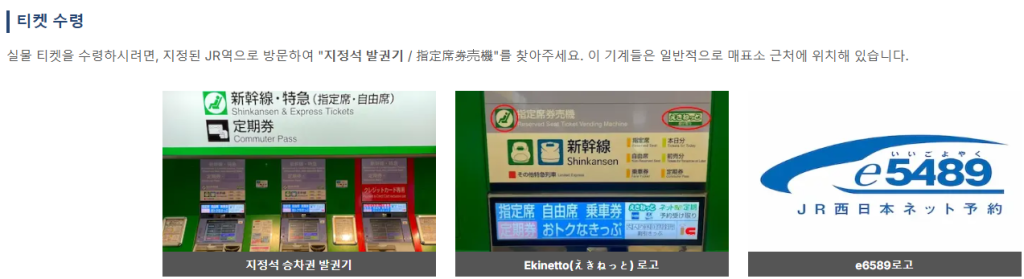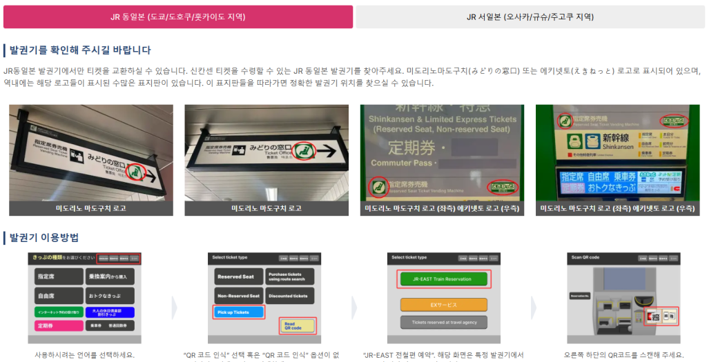일부 역에는 JR 매표소(미도리노 마도구치)가 있어 티켓을 수령할 수도 있습니다. QR 코드를 직원에게 보여주세요. 단, 역무원이 고객님 국가의 언어를 구사하지 못할 수 있으므로 티켓 수령 시에는 자동 발권기 이용을 추천드립니다.